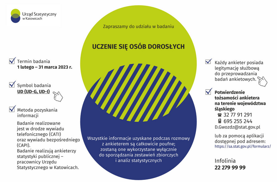 Urząd Statystyczny w Katowicach w terminie 1 lutego – 31 marca prowadzi badanie ankietowe „Uczenie się osób dorosłych”. Badanie odbywa się w formie wywiadu telefonicznego wśród mieszkańców województwa śląskiego.