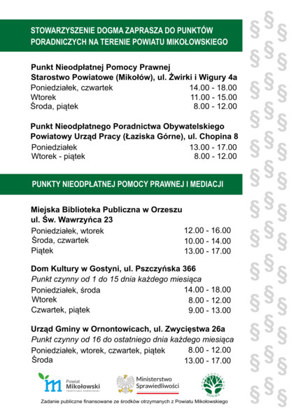 NIEODPŁATNA POMOC PRAWNA, NIEODPŁATNE PORADNICTWO OBYWATELSKIE I NIEODPŁATNA MEDIACJA NA TERENIE POWIATU MIKOŁOWSKIEGO świadczona jest przez Stowarzyszenie DOGMA.