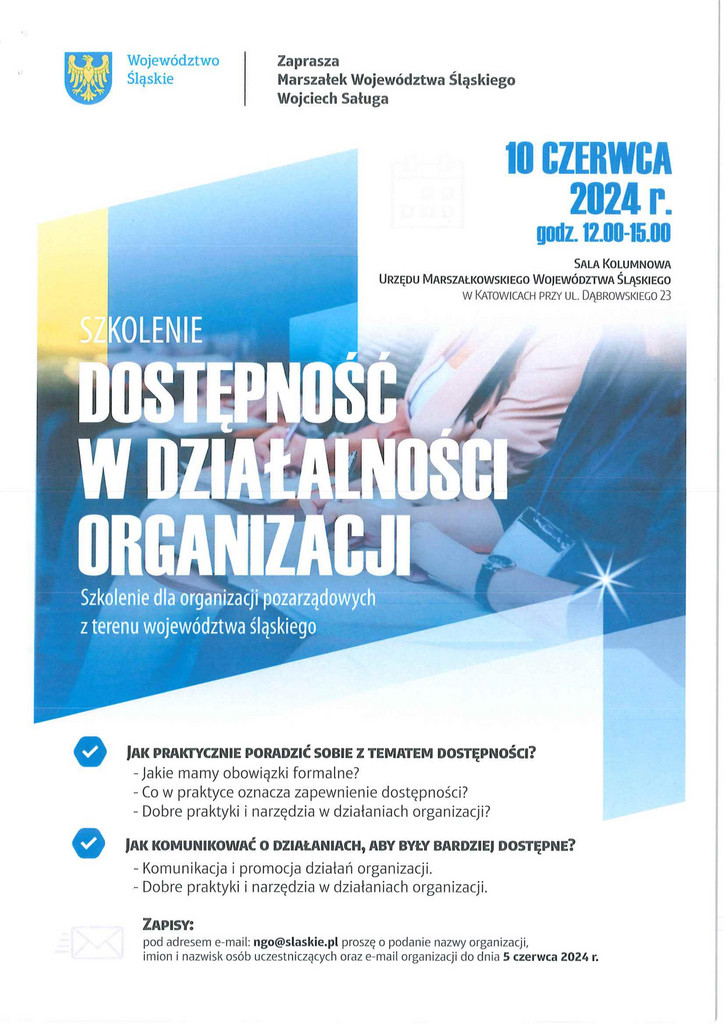 10 czerwca 2024 r. w godzinach od 12.00 - 15.00 w Sali Kolumnowej Urzędu Marszałkowskiego Województwa Śląskiego przy ul. Dąbrowskiego 23 w Katowicach odbędzie się bezpłatne szkolenie "Dostępność w działalności organizacji" dedykowane organizacjom pozarządowym.